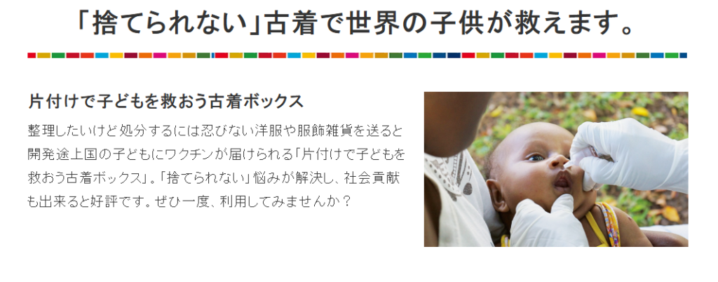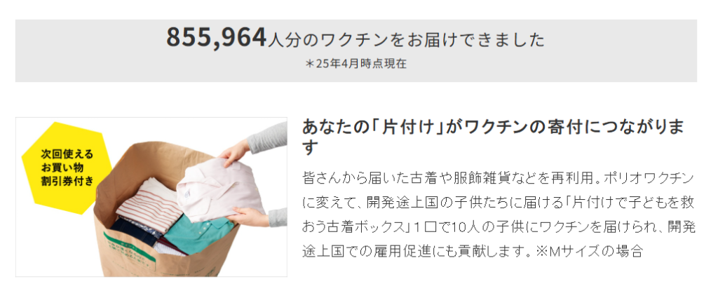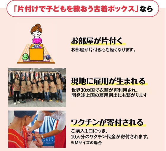不要になった衣類や服飾雑貨を寄付すると、それがポリオワクチンに変わり、1口につき10人の子どもにワクチンが届けられます。