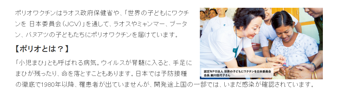 不要になった衣類や服飾雑貨を寄付すると、それがポリオワクチンに変わり、1口につき10人の子どもにワクチンが届けられます。